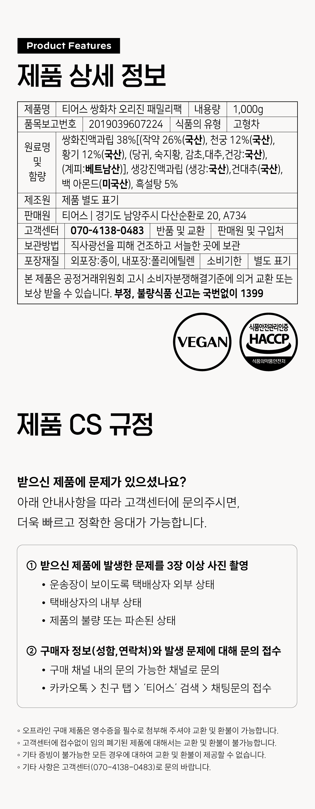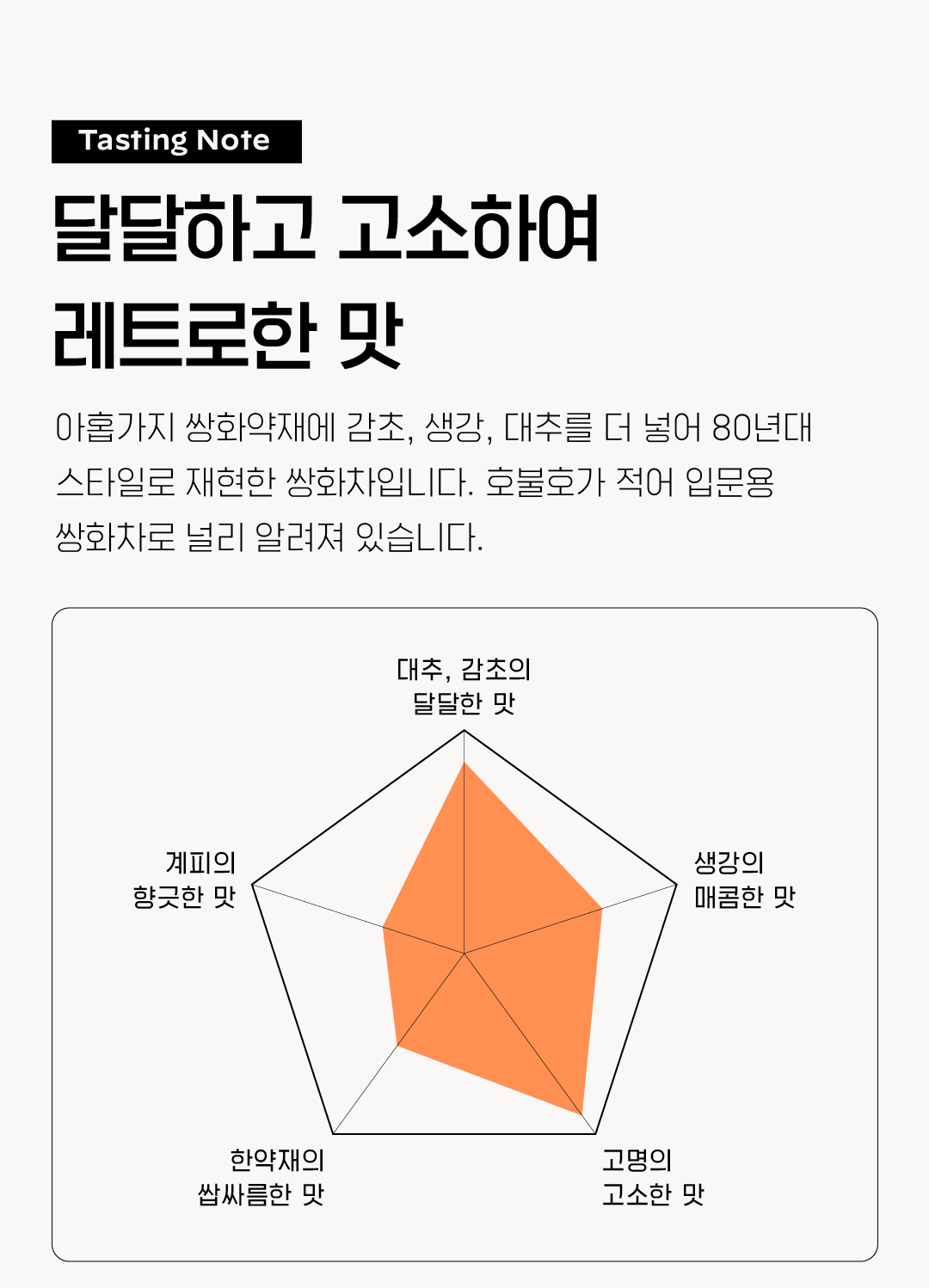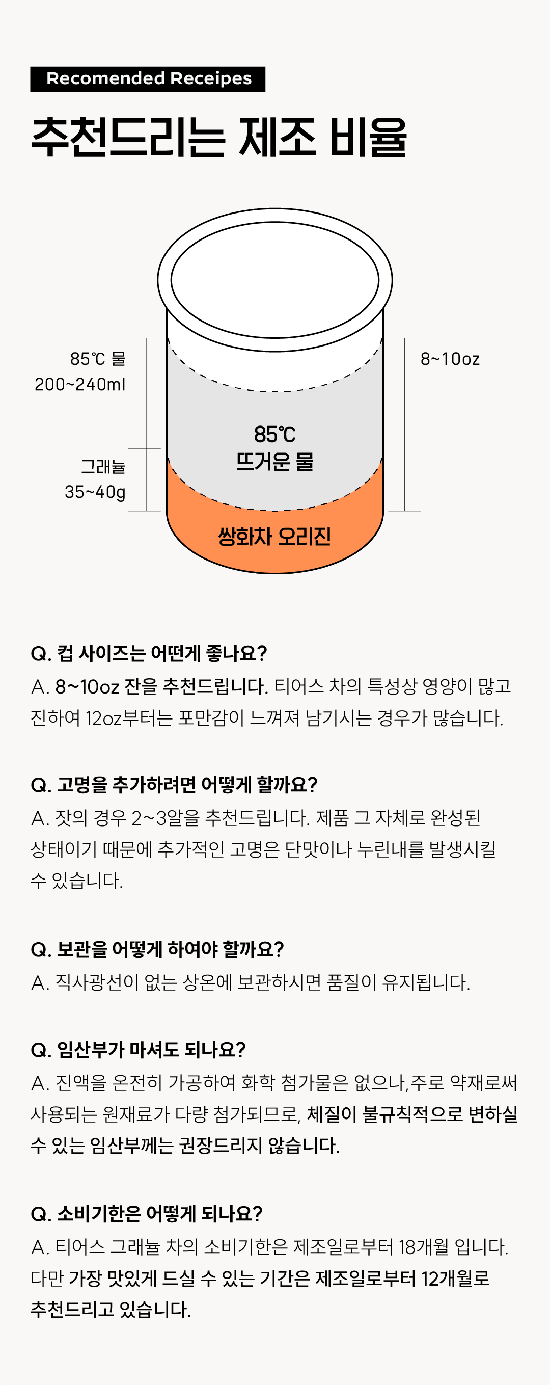 쌍화진액(작약,천궁,황기,당귀,숙지황,감초,대추,건강:국내산) 33%, 생강진액(국내산) 22%, 건대추(국내산) 18%, 로스팅아몬드(미국산) 17%, 로스팅흑설탕 5%